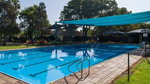 נגיע ליום כיף בבריכה המוקפת בגן עם עצי הדר ופרחי נוי.